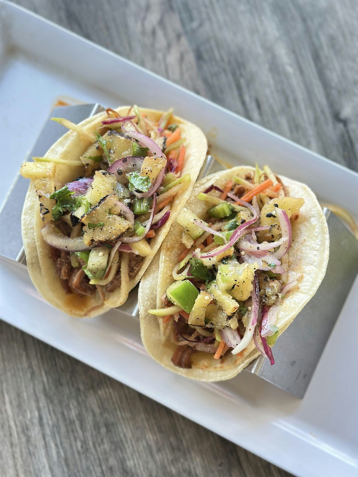 - Smoky Slow Roasted Barbacoa Beef Taco accompanied with a Chayote and Red Cabbage & Lime Slaw and a Charred Pineapple & Tomatilla Pico De Gallo