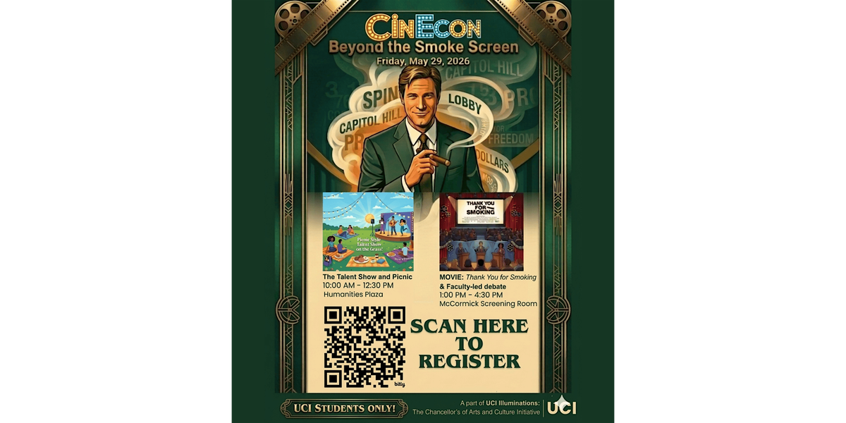 The day is organized into four distinct phases: Phase 1: Engagement & Creative Competition: The event kicks off at the Humanities Plaza with registration and a catered lunch. This phase also involves a "Talent Show" Grand Finale, where students enrolled in my ECON 140 Spring class present creative strategic pitches for peer evaluation and voting during the event. This Grand Finale is the culmination of a curriculum starting in Week 6 where students compete by delivering creative 3-minute pitches that apply economic concepts to controversial industries such as Big Food, Pharma, or Gambling. By blending academic rigor with performance art (song, dance, or drama), students demonstrate how classroom theories manifest in real-world tactics. While preliminary rounds offer extra credit, the Grand Finale on the day of CinEcon Event rewards the top three teams with exclusive UCI prizes for successfully engaging a multidisciplinary audience;