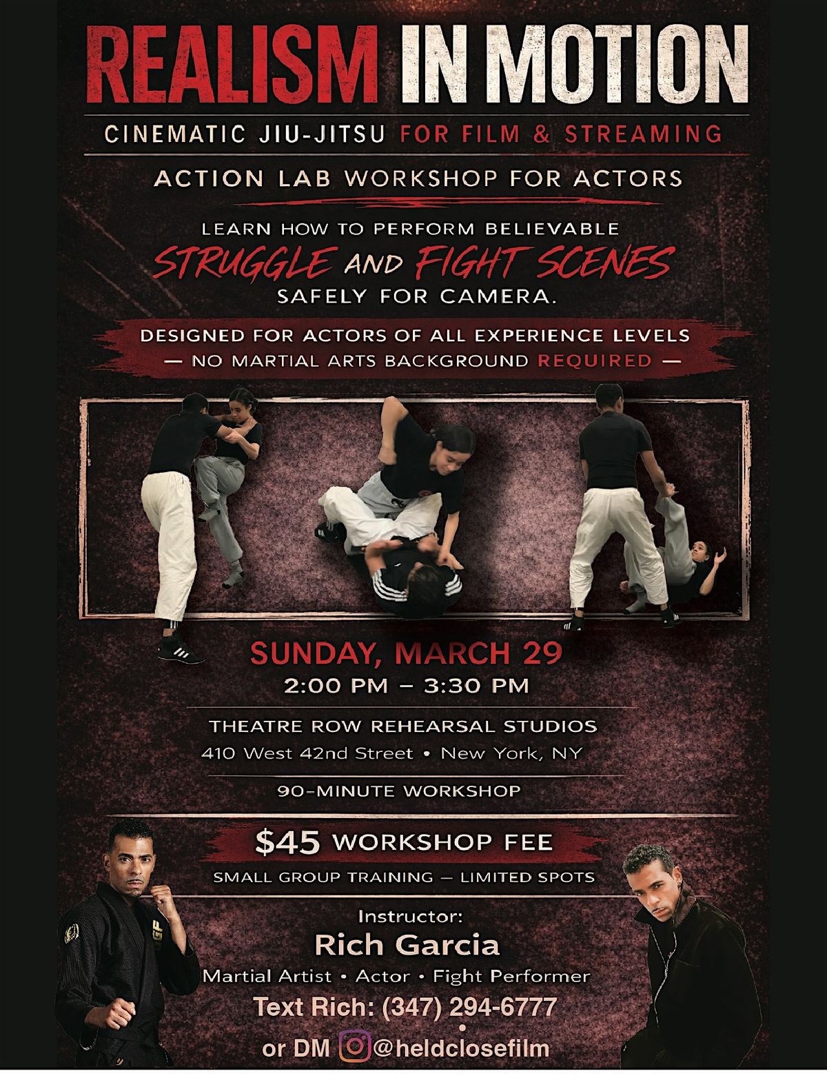 Participants will work through guided scene exercises involving confrontation, struggle, and escape while learning safe techniques drawn from cinematic jiu-jitsu.