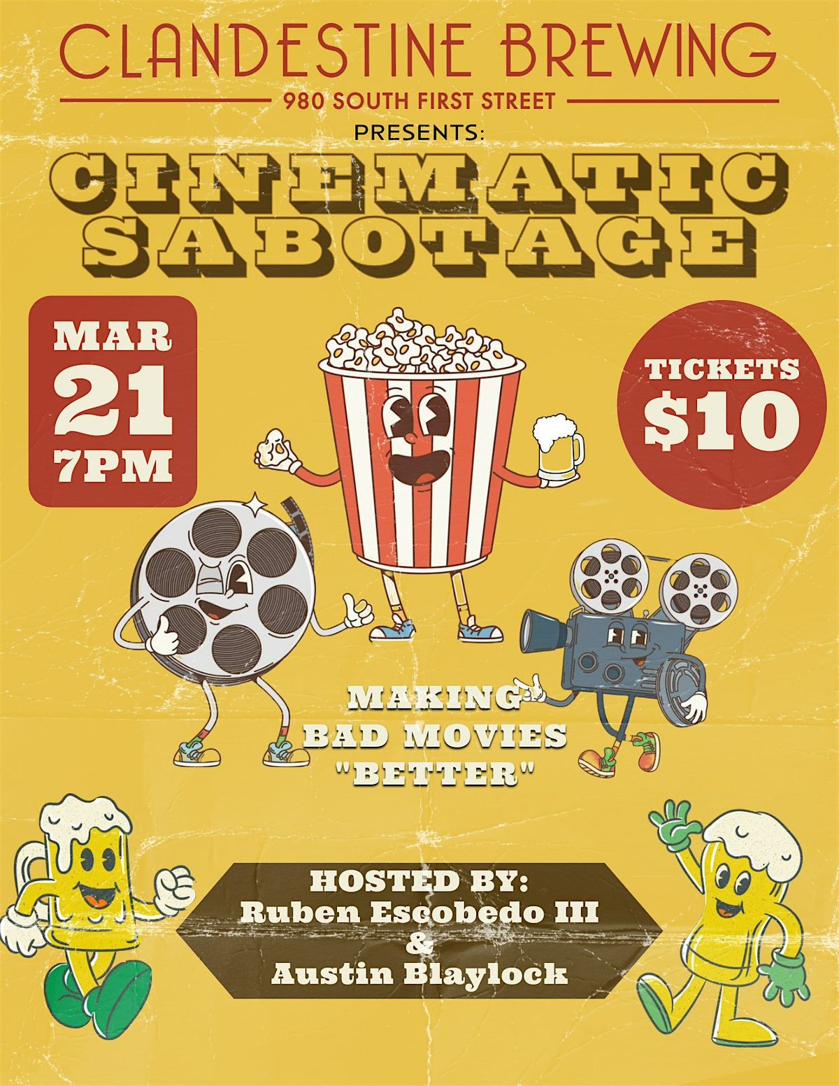 Welcome to Cinematic Sabotage! Get ready for a night of movie mayhem at Clandestine Brewing. Join us on Sat, March 21st at 8:00 PM for a unique cinematic experience like no other. We'll be screening cult classics and hidden gems, with a twist! Each month, comedians Austin and Ruben take the stage to riff, roast, and react to a secret, hilariously awful movie. The twist? The movie’s identity is kept under wraps until the show starts, so expect the unexpected!