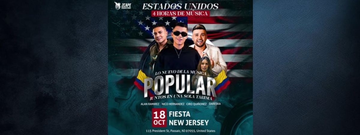 Don't miss Ciro Quiñonez, Nico Hernández, Alan Ramírez, y Special Guest: Dareska juntos en una sola tarima! happening at Fiesta Night Club, Passaic, NJ, United States on 2025-10-18T21:00:00-05:00. A great evening with good music and a laid-back atmosphere awaits you. Invite your friends for a night out! **Event Details:** * **Location:** Fiesta Night Club, Passaic, NJ, United States Claim your ticket to be at the forefront of exciting innovation. #CiroQuiñonez,NicoHernández,AlanRamírez,ySpecialGuest:Dareskajuntosenunasolatarima! #event #exciting #PassaicEvents #NJEvents