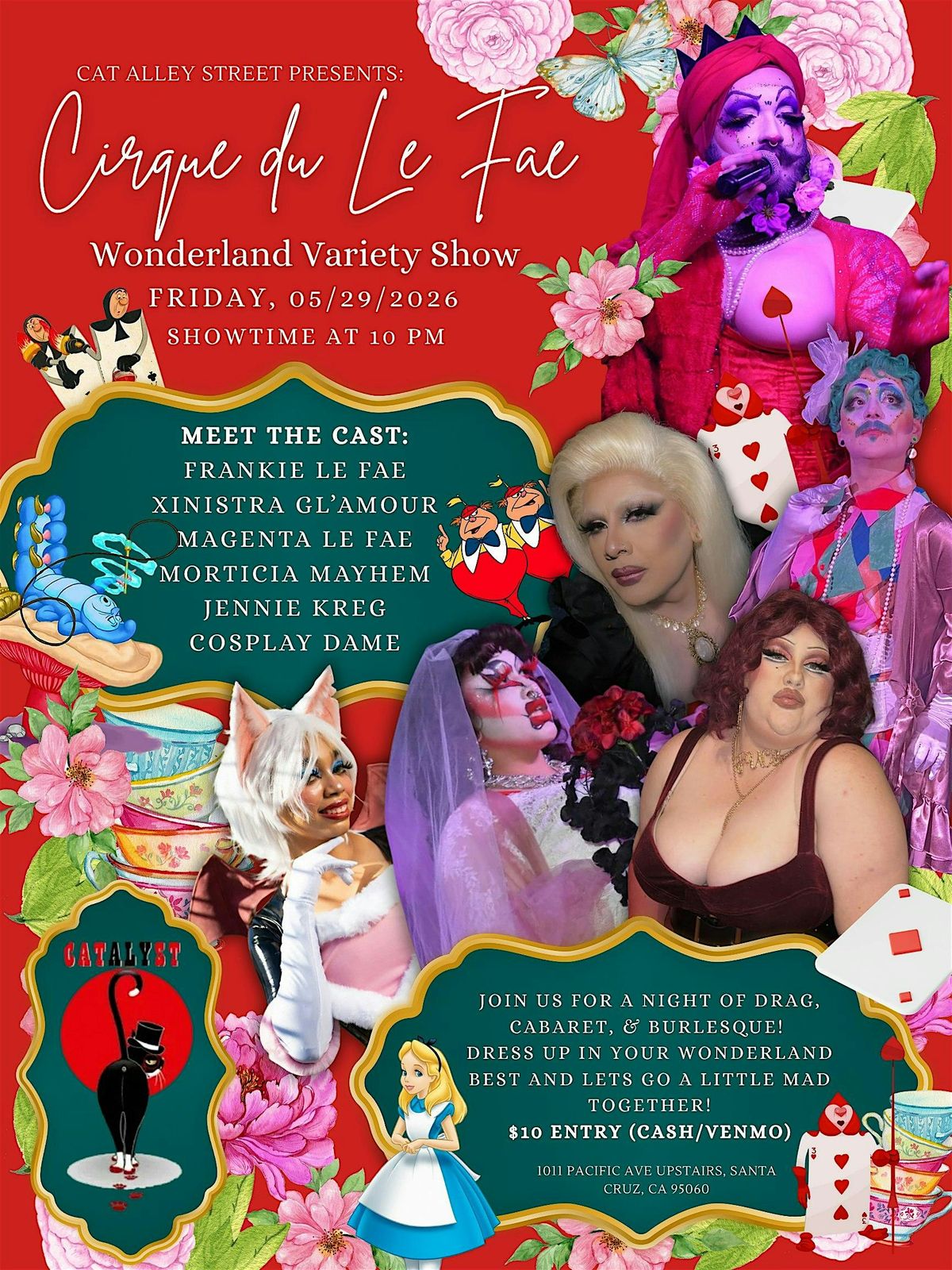 Get ready for an unforgettable night filled with dazzling acts of cabaret, drag, and burlesque with whimsical fun! Dress as your favorite Wonderland character and join us for a campy and sexy theatrical experience! Live singing drag queens, magic, burlesque, puppetry, and a dance party to continue the night after the show!
