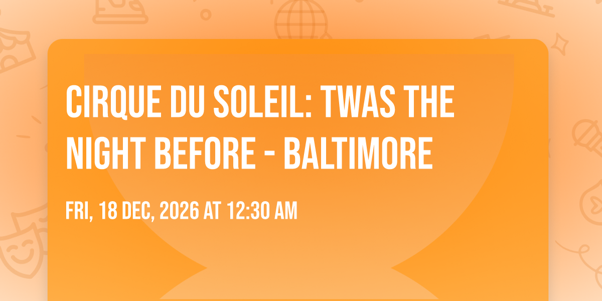 π Location: 39.2899, -76.6217π Welcome to Cirque du Soleil: Twas The Night Before - Baltimore, where dreams come alive and possibilities are endless! ποΈ Join us at Hippodrome at France-Merrick Performing Arts Center in the heart of Baltimore, MD for an event that defies expectations. π On December 27th, 2026 at 11:00 PM, be part of something truly extraordinary as we bring together innovation, entertainment, and pure magic. β¨ Every aspect has been carefully designed to ensure an unforgettable experience for all our guests. Whether you're seeking adventure, inspiration, or simply a break from the ordinary, this event promises to deliver beyond your wildest dreams. π Prepare for a journey into the extraordinary!