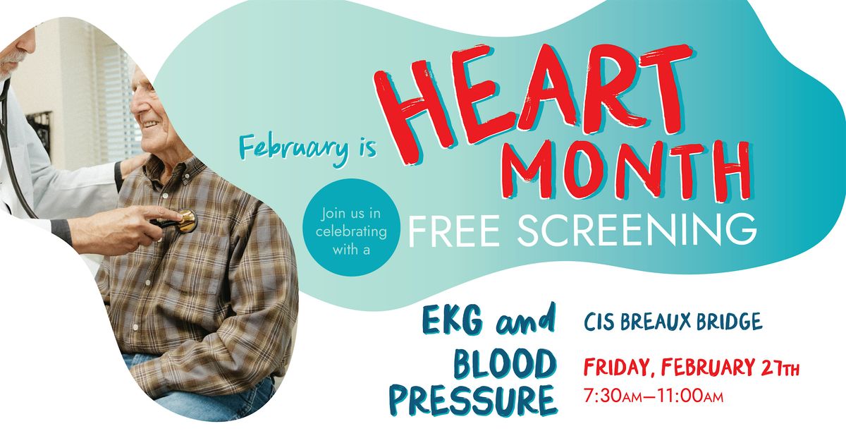 CIS is hosting a free cardiovascular screening at CIS Breaux Bridge on Friday, February 27 at 7:30 am - 11:00 am.