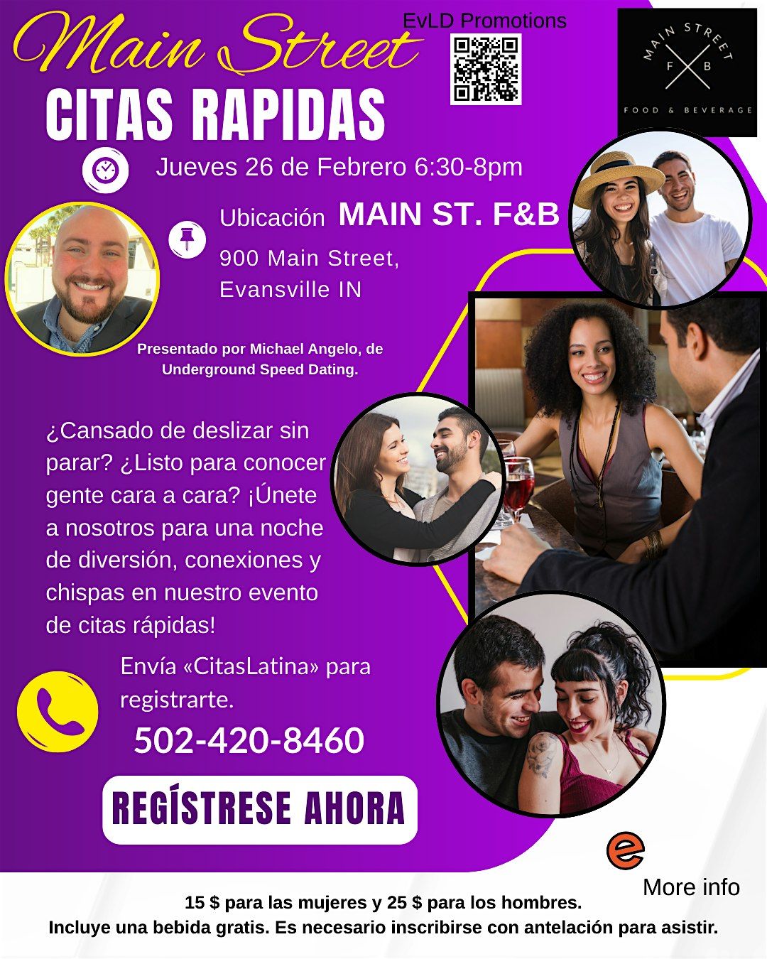 ¡Únete a Main Street Speed Dating para disfrutar de una noche divertida y trepidante en la que podrás conocer a entre 5 y más de 10 posibles parejas en una sola velada!Detalles del evento