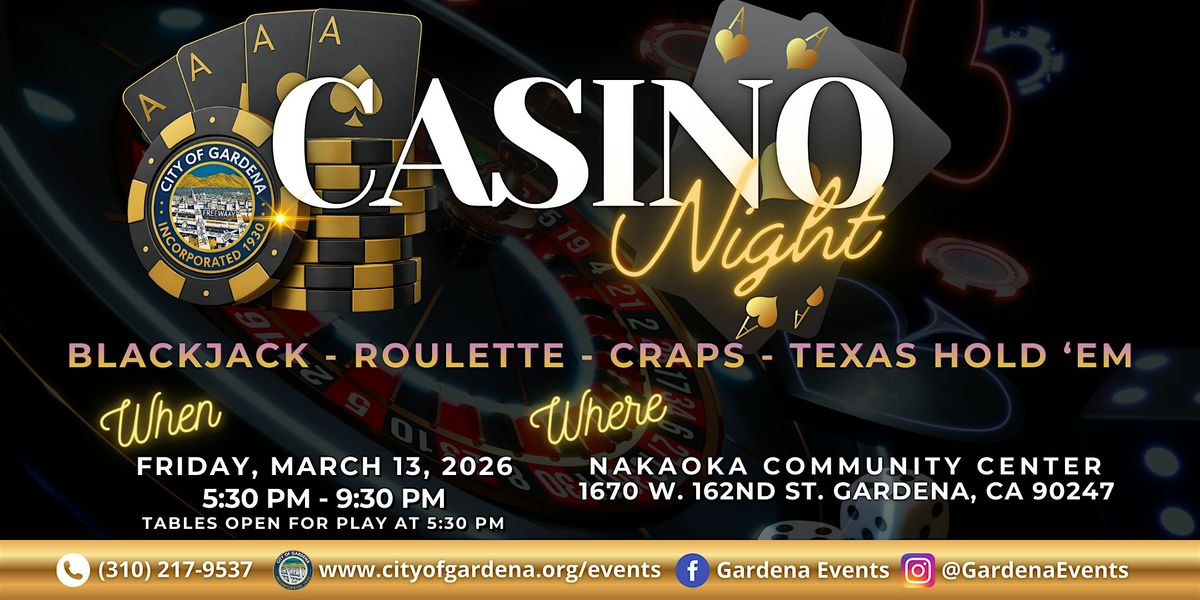 Come and play at the City of Gardena’s Casino Night. Play for a cause as all proceeds from the evening benefit the Senior Citizens Bureau. An admission package is required for entry. Chip packages are available. Take advantage of our Double-Down Special from 5:30 pm to 6:30 pm, you get double the number of chips you purchase just by arriving early and enjoying all the great fun! Don’t miss out on this great night for a great cause, our seniors!