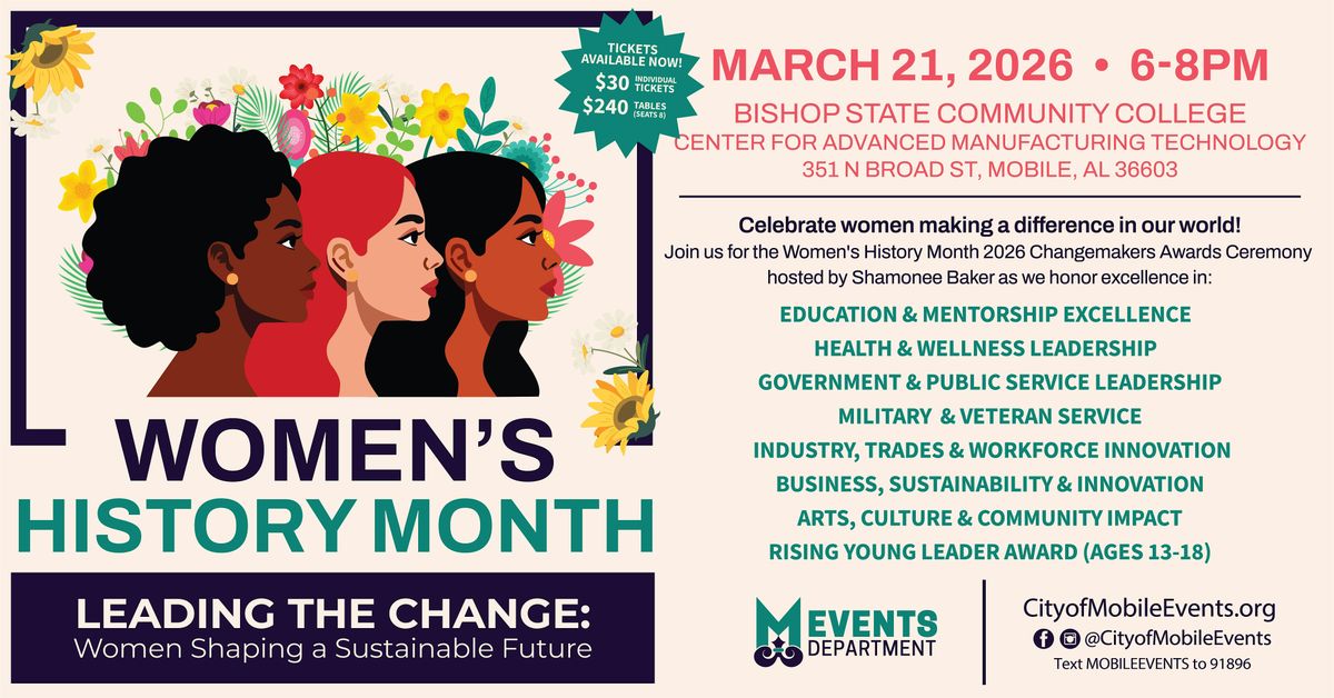 Welcome to the City of Mobile Events Women's History Month Celebration! Join us at Bishop State Community College on March 21, 2026, at 6:00 PM (Central Time) to honor and celebrate the incredible achievements of women throughout history. This event is a tribute to all the changemakers who have made a lasting impact on society. Let's come together to recognize and appreciate the contributions of women in shaping our world. Don't miss this special occasion filled with inspiring stories, empowering messages, and meaningful connections. See you there!