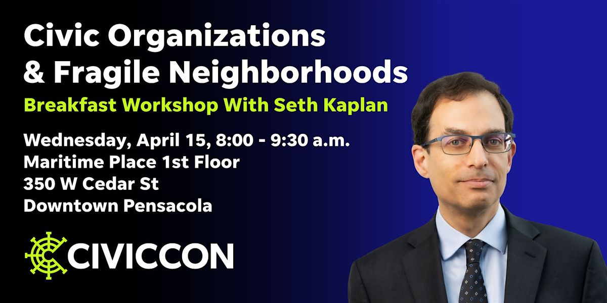 Seth Kaplan will also deliver a free public CivicCon presentation in Pensacola on Tuesday, April 14 (Register for that here). This breakfast gathering offers a more focused setting for civic leaders to engage directly with the ideas from Fragile Neighborhoods and apply them to their work.