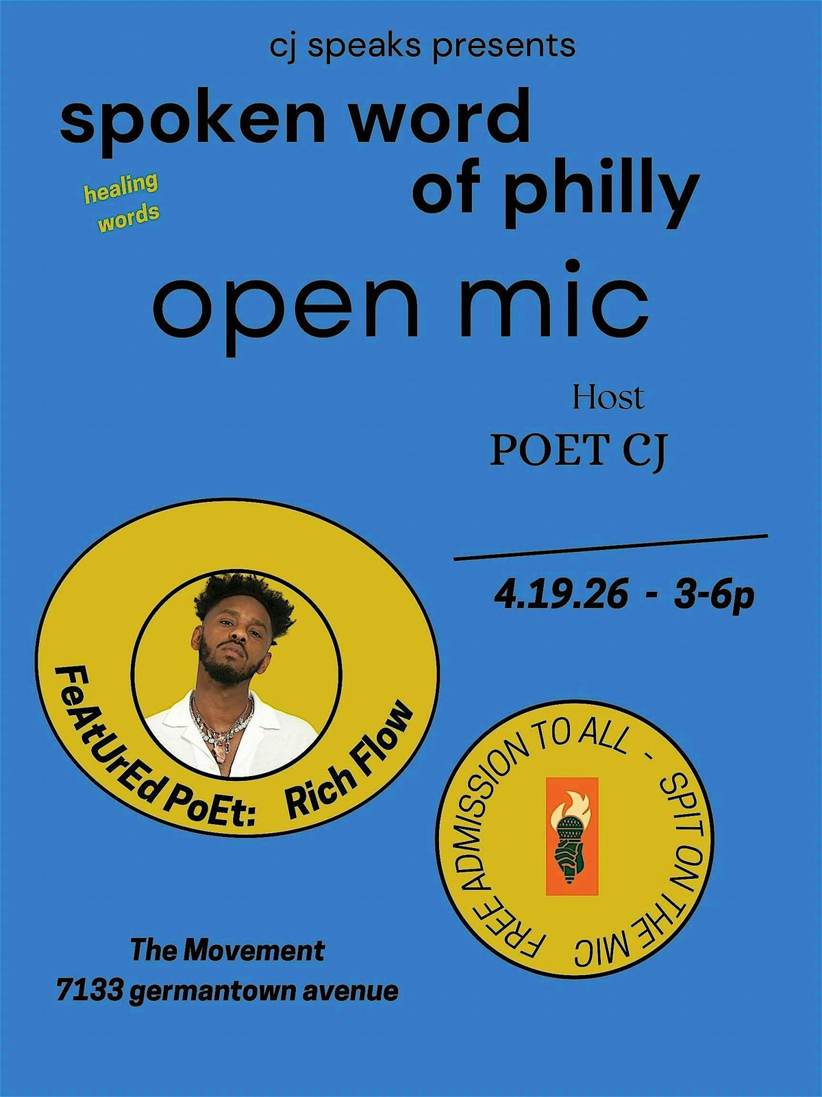 join us on sunday, 4.19.26 at 3p for an awesome afternoon of raw, real spoken word with host poet cj and poets. this in-person event at The Movement is all about philly vibes and powerful voices. come through, feel the energy, and support local talent in a chill, welcoming space. do not miss out on some unforgettable poetry and good times! hope to see you in the house of words with the FeAtUrEd PoEt: Rich Flow...
