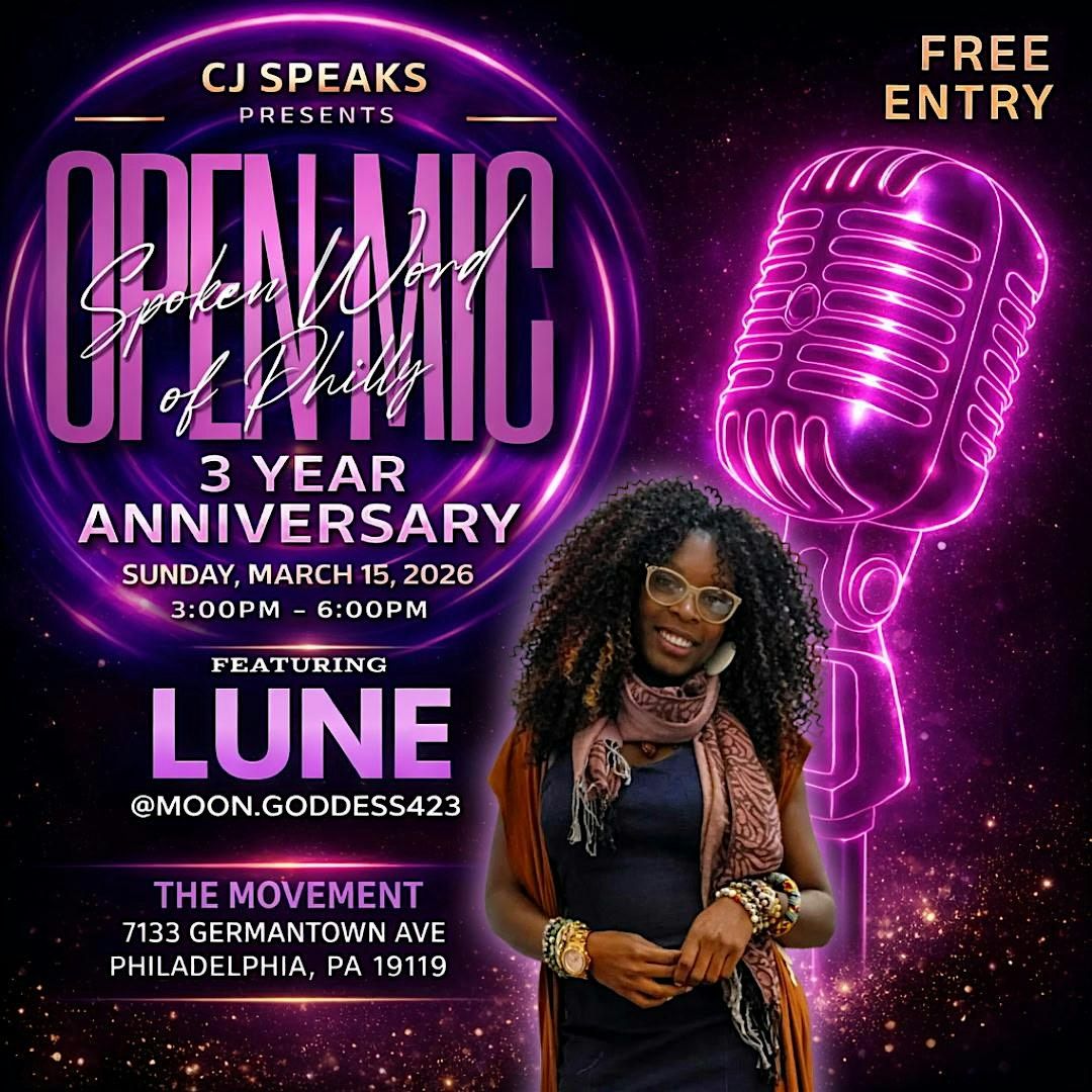 join poet cj and fellow poets, spoken word artists, freestyle poets, wordsmiths, and poetry reading individuals and listeners for an afternoon of words hitting walls and bouncing into the ears of all in the room. open mic takes place with newcomers, returning poets, and a FeAtUrEd PoEt, Lune each month on the third sunday. admisstion is free and the door is open to all. come out and help celebrate 3 years of Spoken Word of Philly at The Movement located at 7133 germantown avenue, in the east mount airy section of philly, pa. this is an event that will change your life and heal your heart. hope to see you in the house of words on 3.15.26 beginning at 3p until 6p.