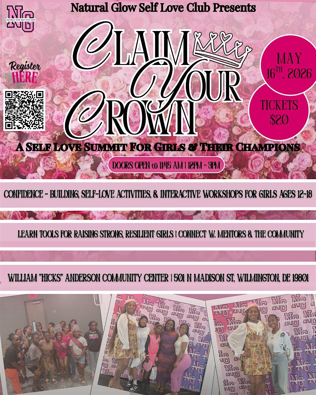 Claim Your Crown: A Self-Love Summit is an exhilarating day presented by Natural Glow Self Love Club — a vibrant Delaware-based 501(c)(3) nonprofit on a mission to empower girls from kindergarten through 12th grade. This summit is crafted especially for girls in grades 5th–12th and the incredible village that supports them — parents, guardians, mentors, and teachers. When a girl is uplifted by those who believe in her, the sky's the limit!