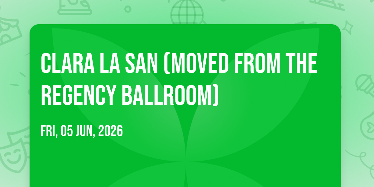 π Location: 37.7827, -122.41β¨ Discover the extraordinary at Clara La San (Moved From The Regency Ballroom), where magic meets reality in ways you've never imagined! ποΈ Set in The Warfield nestled in bustling San Francisco, CA, this event promises to be a landmark occasion. π Taking place on June 5th, 2026 at 03:00 AM, it's going to create an atmosphere where every moment becomes a cherished memory. π Immerse yourself in an experience crafted with attention to every detail, designed to surprise and delight at every turn. They have worked tirelessly to ensure this event exceeds all expectations, bringing together elements of entertainment, innovation, and pure joy. π Don't miss your chance to be part of this remarkable journey!