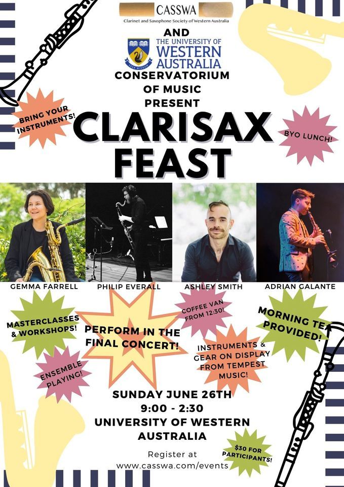 CASSWA is pleased to announce that our annual ClariSax Feast will return in 2022 on Sunday 26th June, 9.00am-2.30pm, with concert scheduled to start at 1.30pm.Featuring guest artists Ashley Smith, Phil Everall, Gemma Farrel and Adrian Galante.