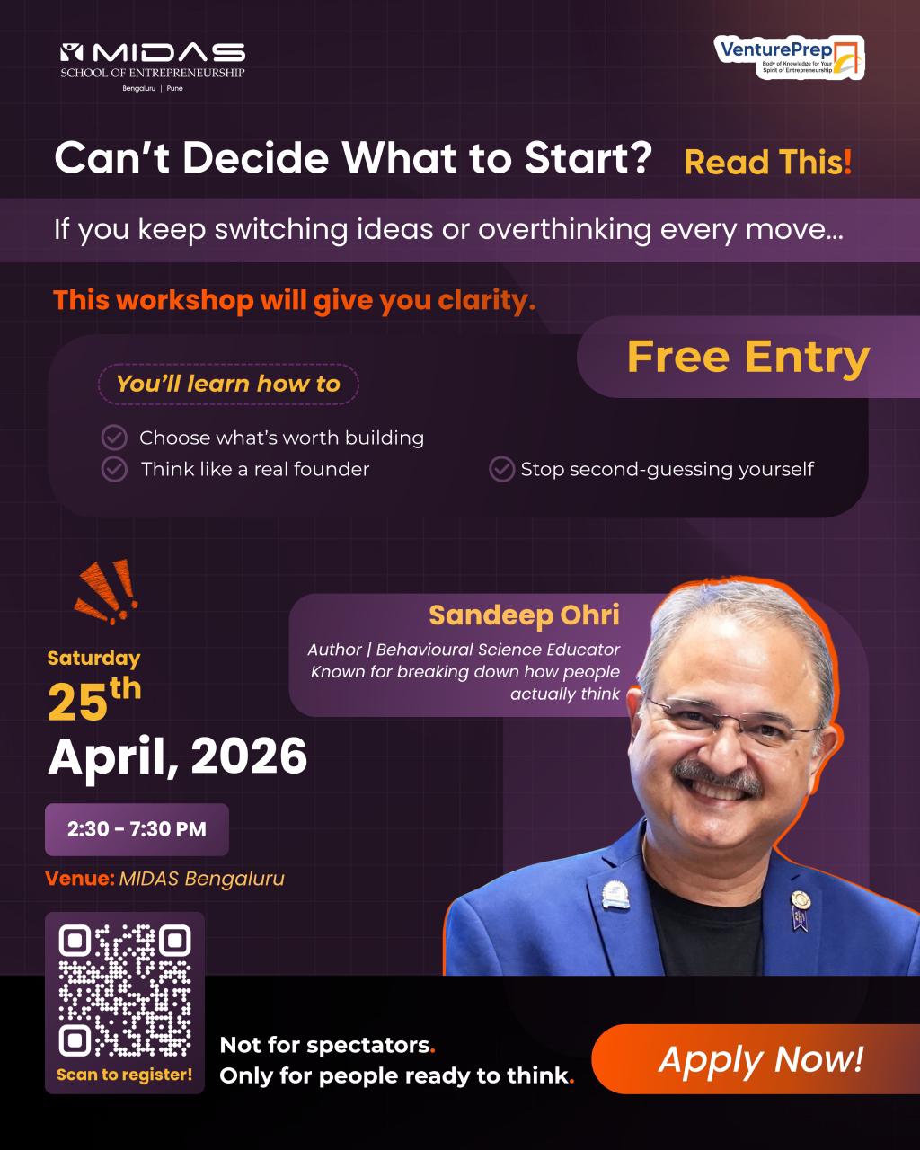 Experience the power of transformation at this not-to-be-missed event brought to you by MIDAS School of Entrepreneurship Bengaluru. Embrace clarity, ignite your potential, and shape a brighter future for yourself. Book your tickets now and embark on a journey of self-discovery like never before!