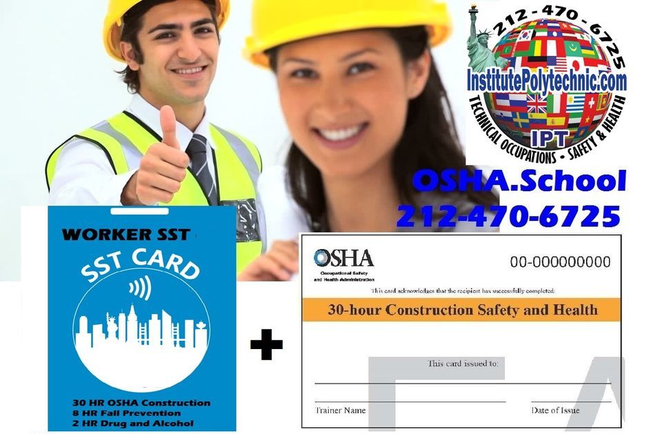 Presencial En Espanol CLASE 40 HORAS CONSTRUCCION (REQUIRE OSHA30 + SST10)OSHA30 En QUEENS Julio 2, 3, 9, 10 de 9:00AM-5PM Sabados y Domingos al finalizar Recibira Certificado y su Tarjeta official Occupational Safety and Health, (OSHA30 is Pre-Requisite for SST10 and other Certifications).