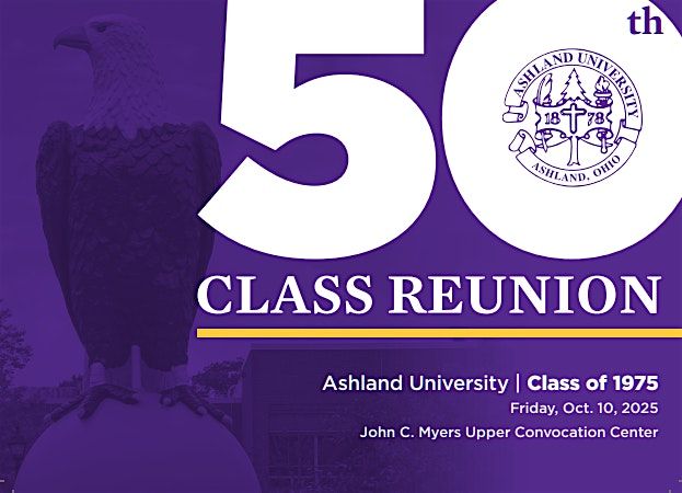 Come join us at Ashland University for a memorable in-person event celebrating the 50th reunion of the Class of 1975. Reconnect with friends, reminisce about the good old days, and create new memories together. This is a special occasion to honor our shared experiences and achievements over the years. Don't miss out on this opportunity to catch up with fellow classmates and relive the glory days. See you there!