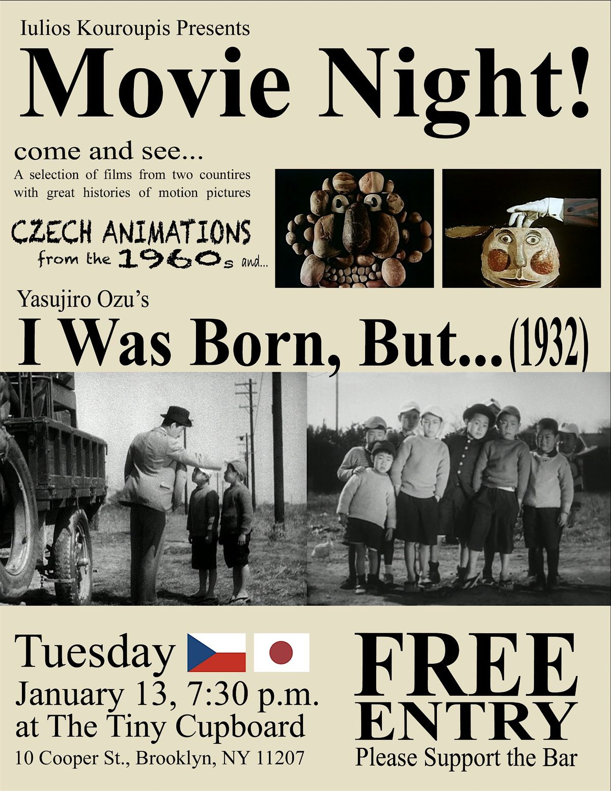 Grab a drink from the bar, and enjoy a selection of films which will include a short program of Czech animations from the 1960s followed by a screening of the wonderful 1932 Silent Japanese Comedy "I Was Born But..." by the legendary Yasujirô Ozu
