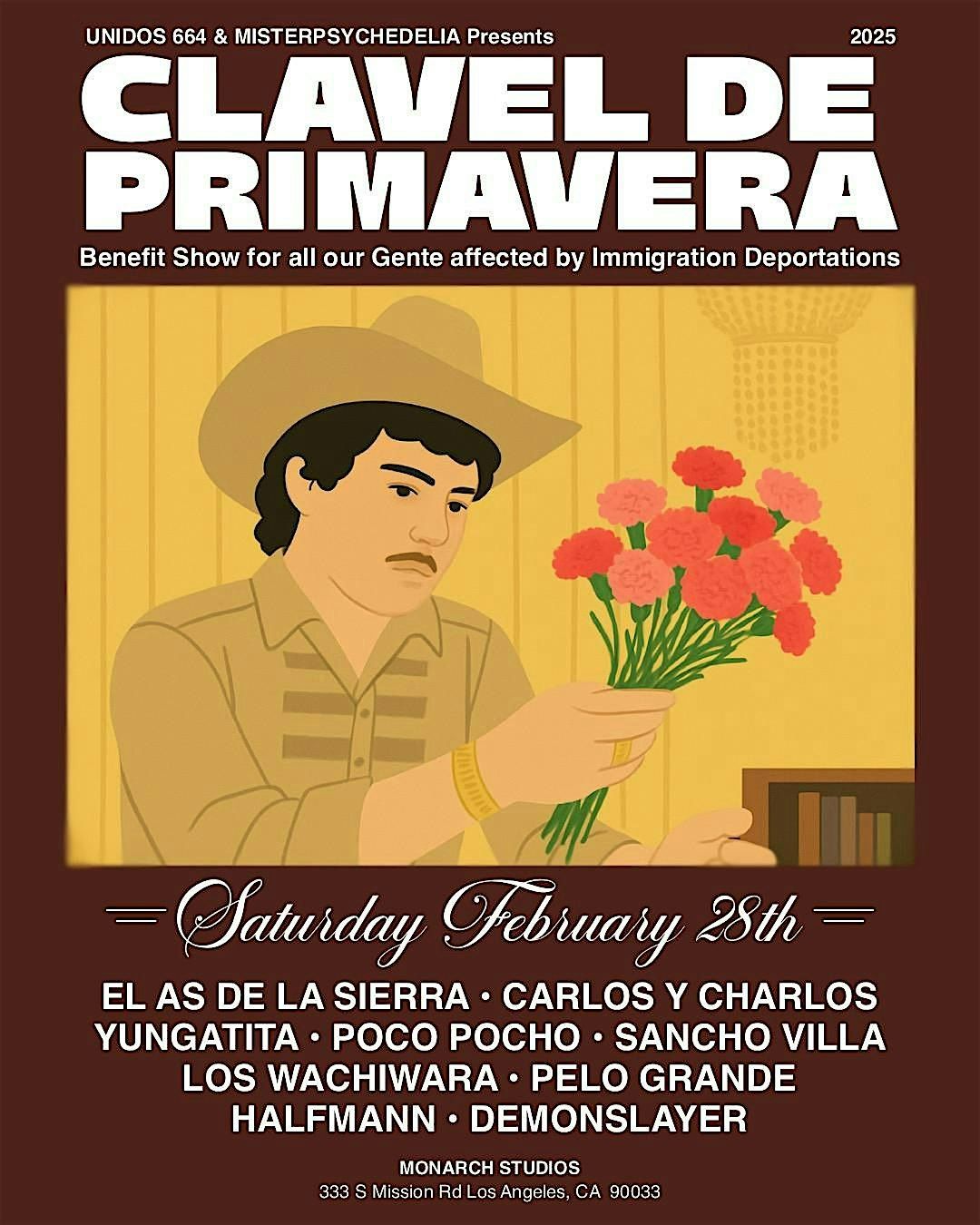 Welcome to Clavel De Primavera! 🌺 Join us at Monarch Studios LA on February 28, 2026 at 12:00 PM for a day filled with music, art, and good vibes. Let's celebrate the arrival of spring together! 🌸 With these current times of Disruption we put together this Amazing event to Support our Gente that have been affected by these current Immigration Deportation. We present this stacked line up for your enjoymen. Family Friendly Event. Lucha Libre Exhibition presented by Unapologetic Pro.