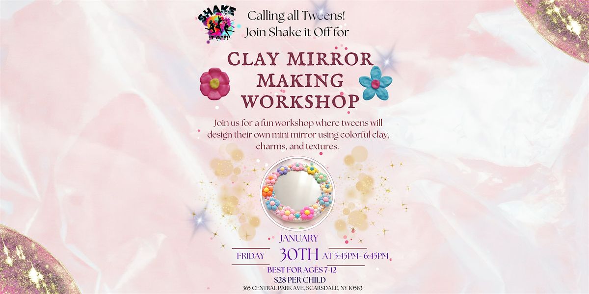 Calling all tweens! Join Shake it Off for a creative and hands-on Clay Mirror Making Workshop, where kids will design and decorate their very own mini mirror using colorful clay, charms, and fun textures.