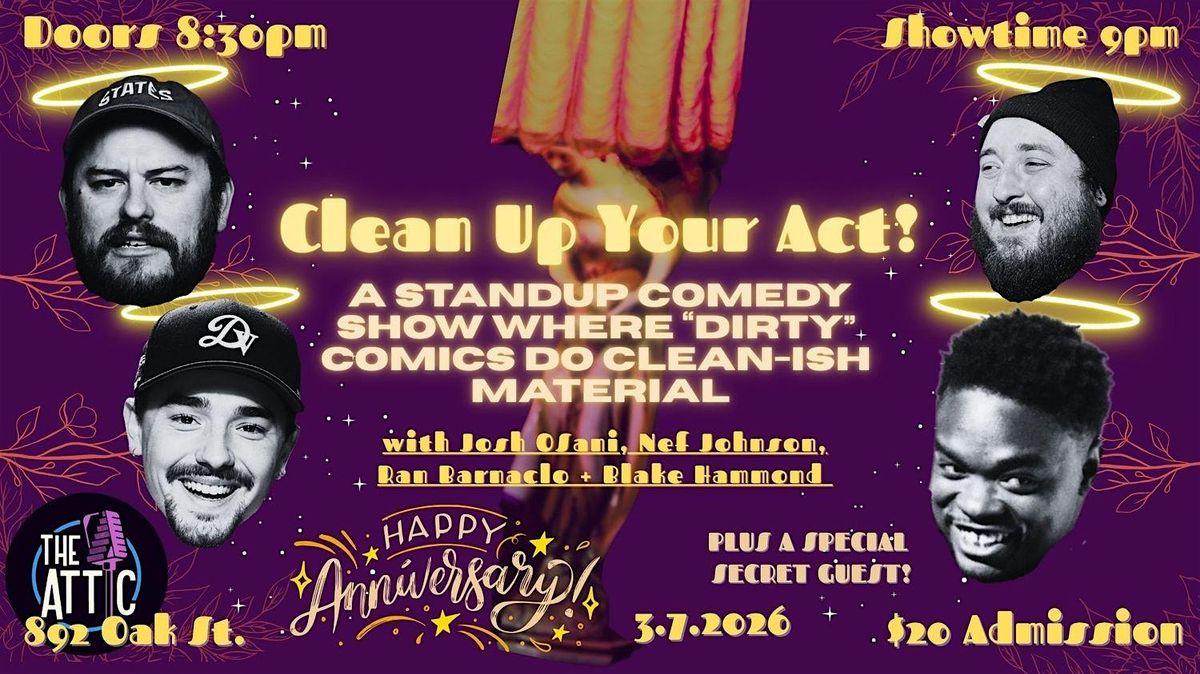 Clean Up Your Act is a clean(ish) comedy show where handpicked local and regional “dirty” comics have to do their best to keep things clean.