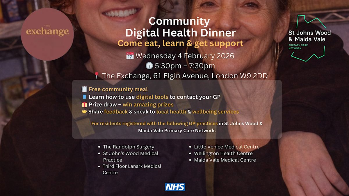 Join us for a friendly and informative Community Digital Health Dinner, designed especially for residents registered with GP practices in the St John’s Wood & Maida Vale Primary Care Network.