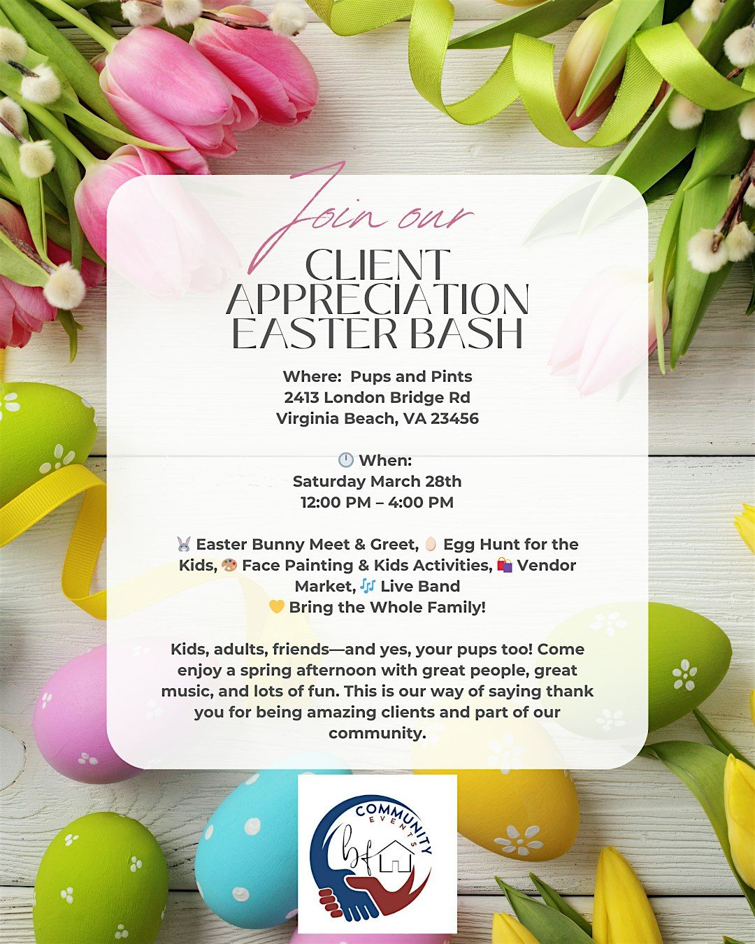 Kids, adults, friendsโand yes, your pups too! Come enjoy a spring afternoon with great people, great music, and lots of fun. This is our way of saying thank you for being amazing clients and part of our community.