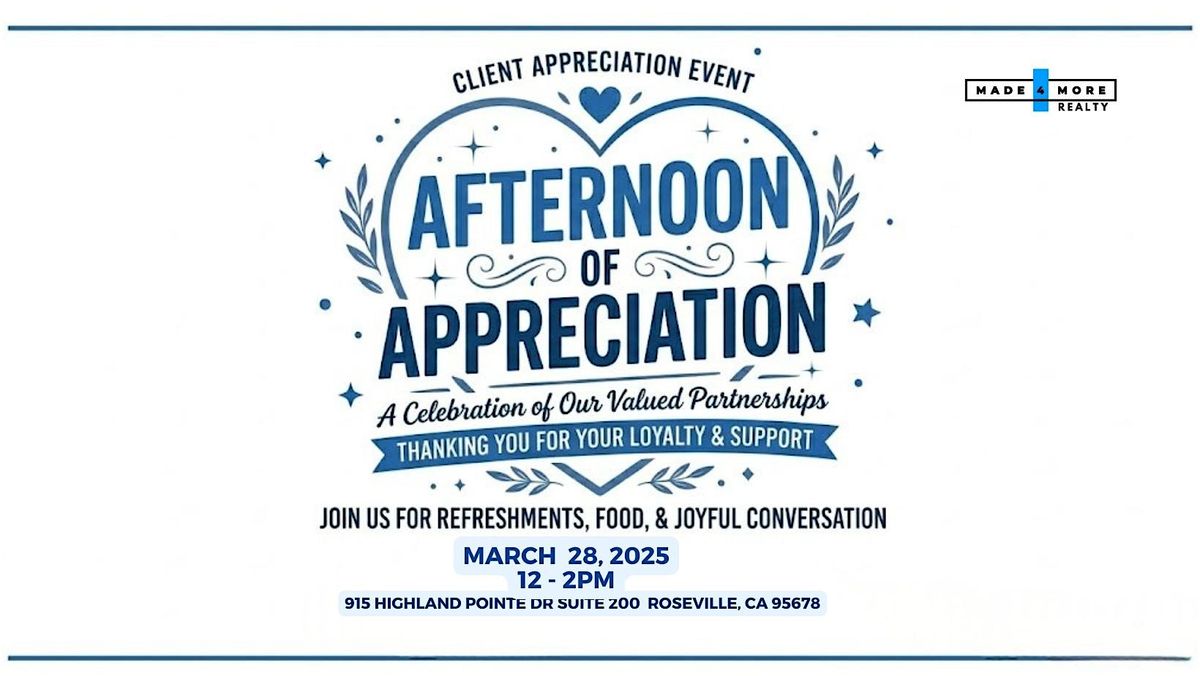 At Made 4 More Realty, we know that our success is built on the incredible relationships we share with our clients and partners. To say thank you for your continued loyalty and support, we invite you to join us for an Afternoon of Appreciation.