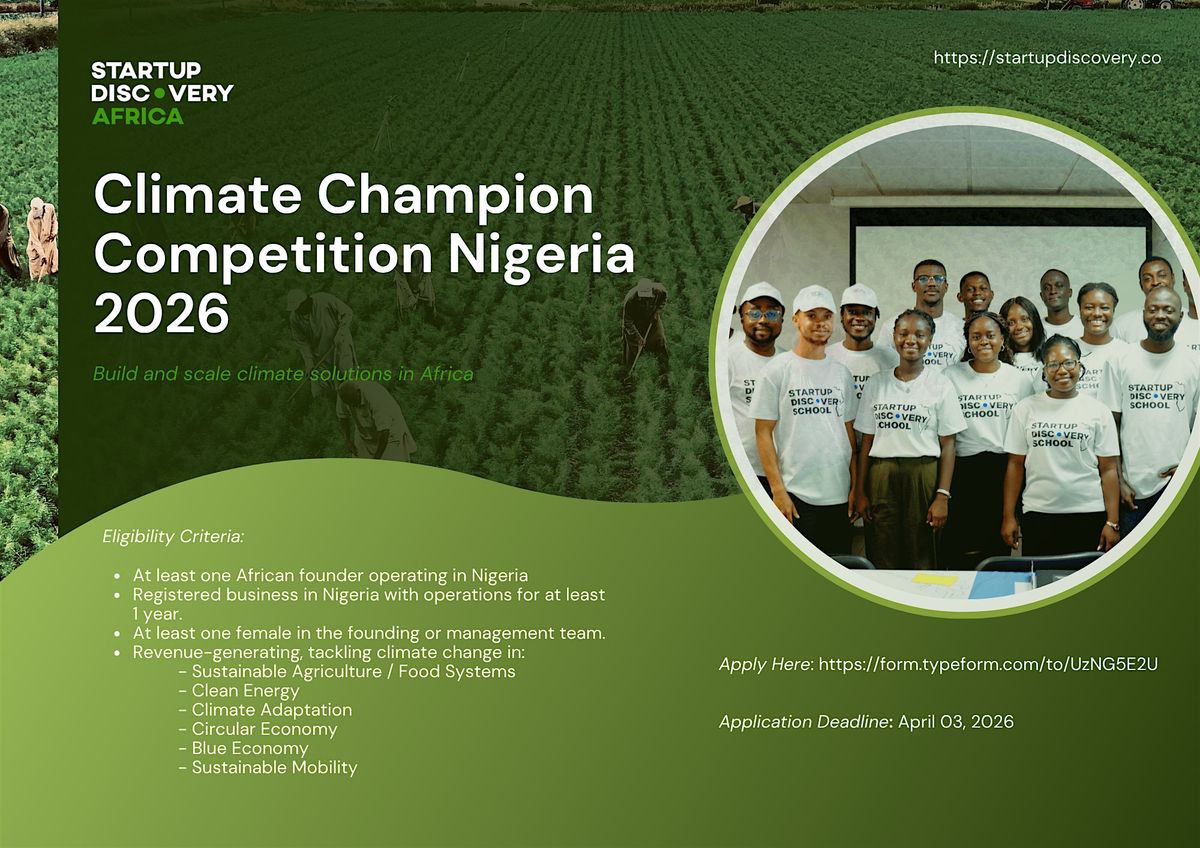 Startup Discovery is launching in Nigeria through the Climate Champion Competition, an initiative that identifies top climate innovators, providing them a platform to access grant opportunities, and potential entry into the Venture Studio Program under the theme: Expanding Impact through Innovation: Building a Sustainable Africa. This will be a great access to key ecosystem players including investors, ESOs, DFIs and other climate innovators to connect, engage and collaborate for greater impact