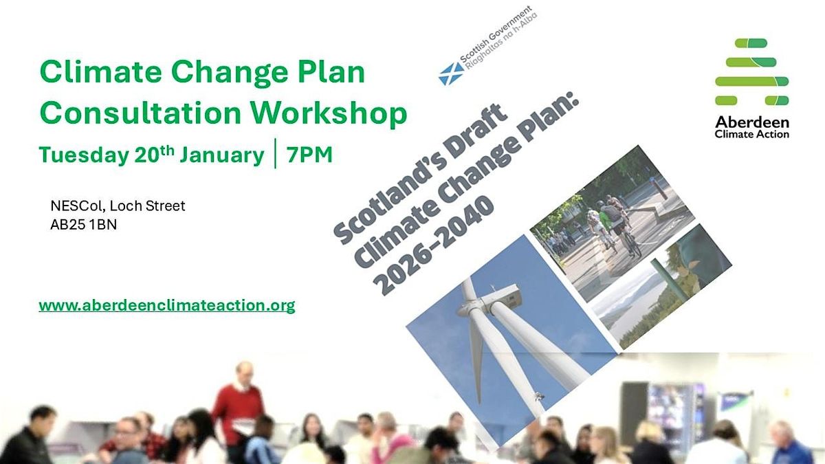 Aberdeen Climate Action will run a facilitated workshop with the specific aim of getting answers from our audience to the Government's "consultation questions" in the plan. We will give a short background to the plan and then take you through the questions, compiling your answers to each. The workshop is being conducted in association with NESCAN who are coordinating a number of similar events across the City and Shire, some online. We will compile the answers and report back both to NESCAN and the Scottish Governent as an ACA response.