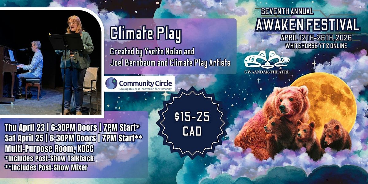 Over the past three years, Climate Play has created eight hyper-local verbatim plays in eight different communities, including Whitehorse. The national Climate Play braids together four main elements from the plays: the script edited from the transcripts of the interviews; photos and videos of local land, water, and nature filmed by local artists in each community; a mid-show facilitated audience discussion; original music inspired by the transcripts of the interviews, including a new song generated from the end Act I discussion and performed for the first time.