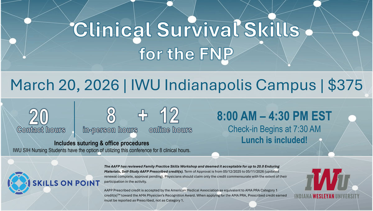 Join us as we host Skills On Point to teach clinical survival skills for the FNP. We will spend 8 hours learning/practicing suturing and office procedures. You will also gain access to 12 additional online learning contact hours, totaling 20 hours from this event. Lunch will be provided.