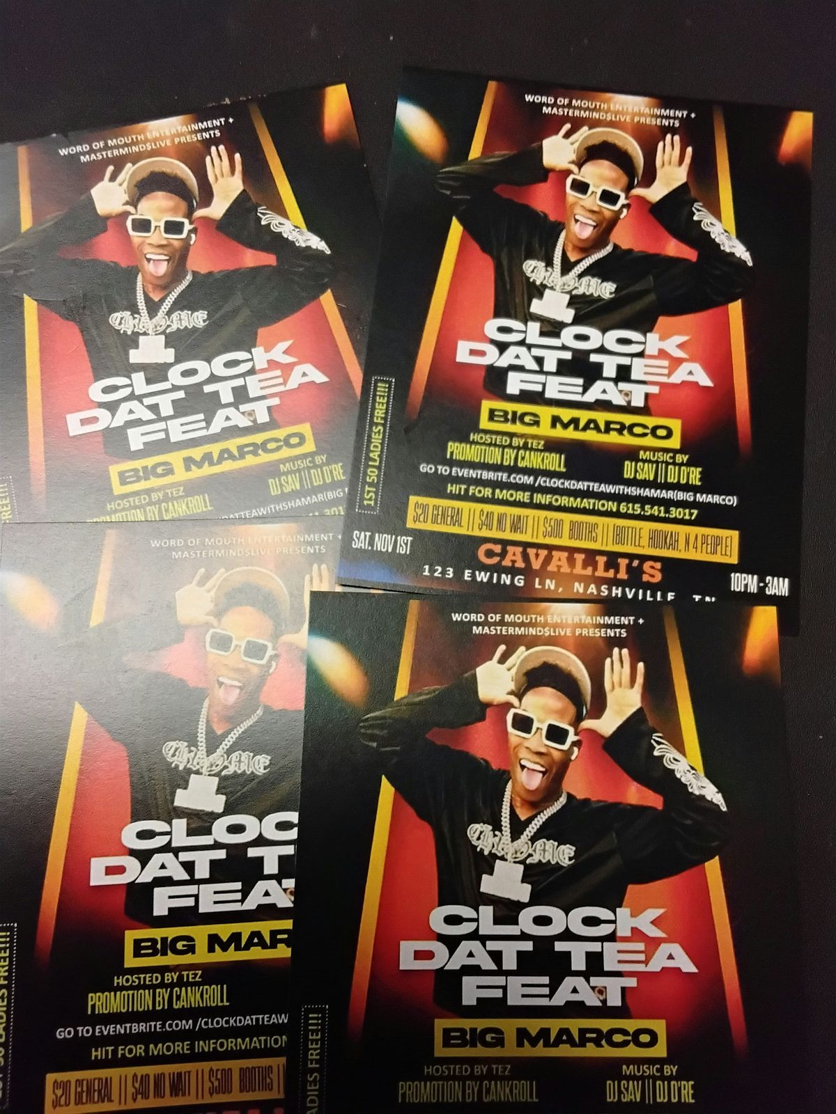 Get ready for a night of beats and bottles at Cavalli's Lounge! Join us for CLOCK DAT TEA FEAT BIG MARCO, where the music will be hot, and the ladies will be lit. Big Marco is bringing his A-game, so don't miss out on this epic event.