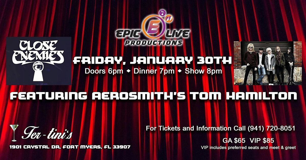 Get ready for an amazing night out with Close Enemies rocking the stage live at Ter-tini's! Joining them is the legendary Tom Hamilton of Aerosmith for an unforgettable in-person experience. Don’t miss this chance to catch incredible tunes and good vibes all in one spot. Grab your crew and head over for a night full of great music and fun!