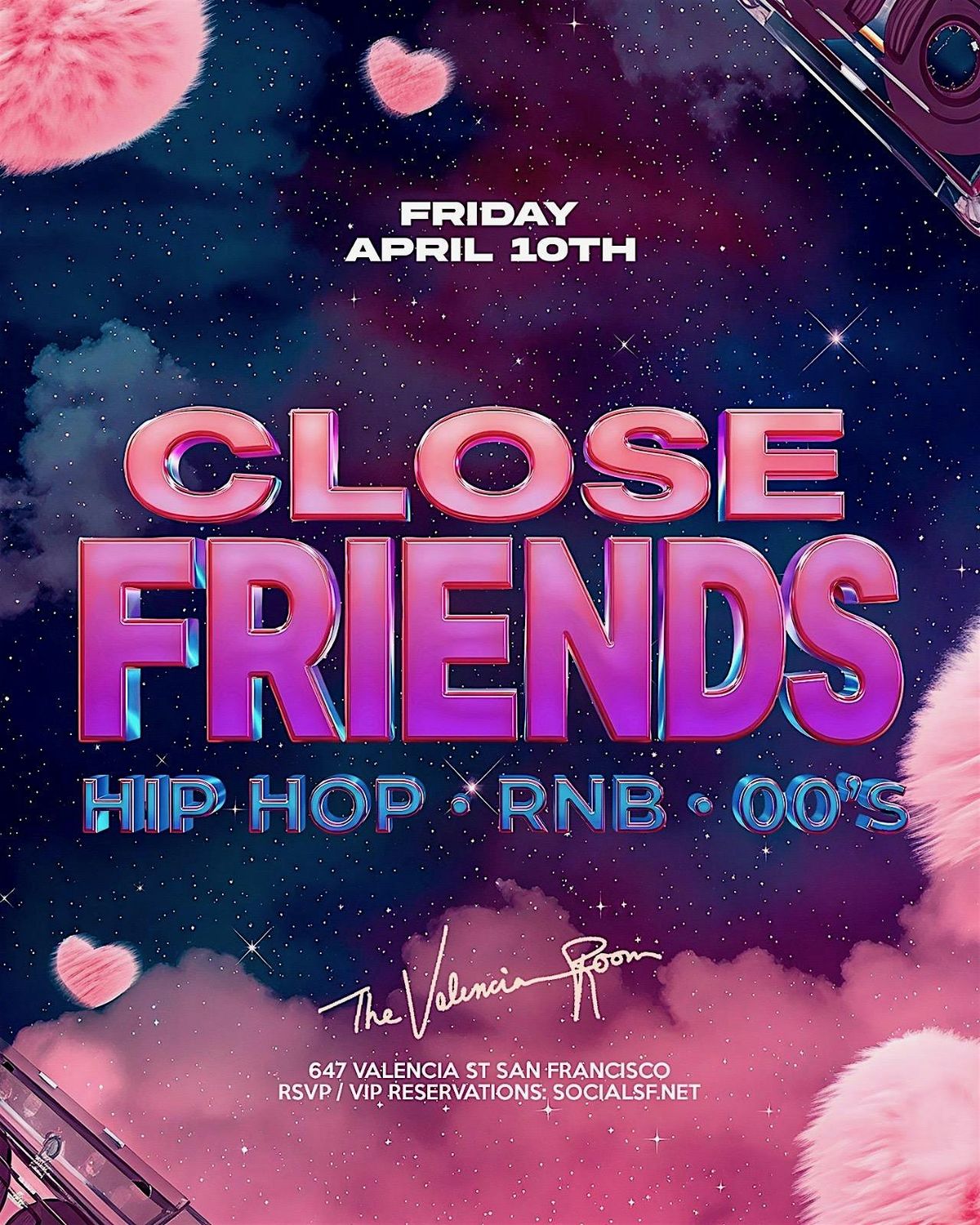 Close Friends - Hip Hop - RNB - 00's. The real ones inside, everyone else watching. Bottles popping, sweat dripping, and Bad decisions encouraged.