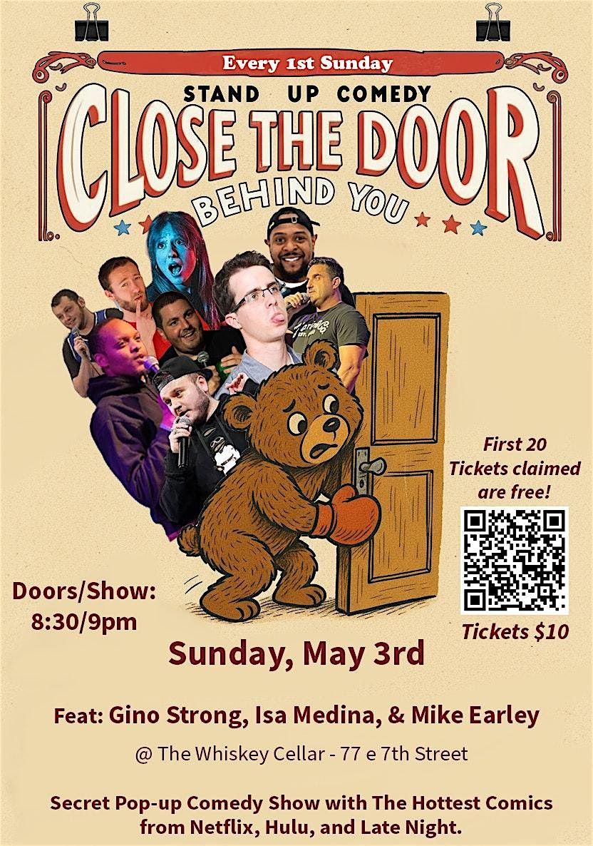 Join us for a night of laughs at the Close the Door Behind You Comedy Show on May 3rd - don't forget to shut the door on your way in!