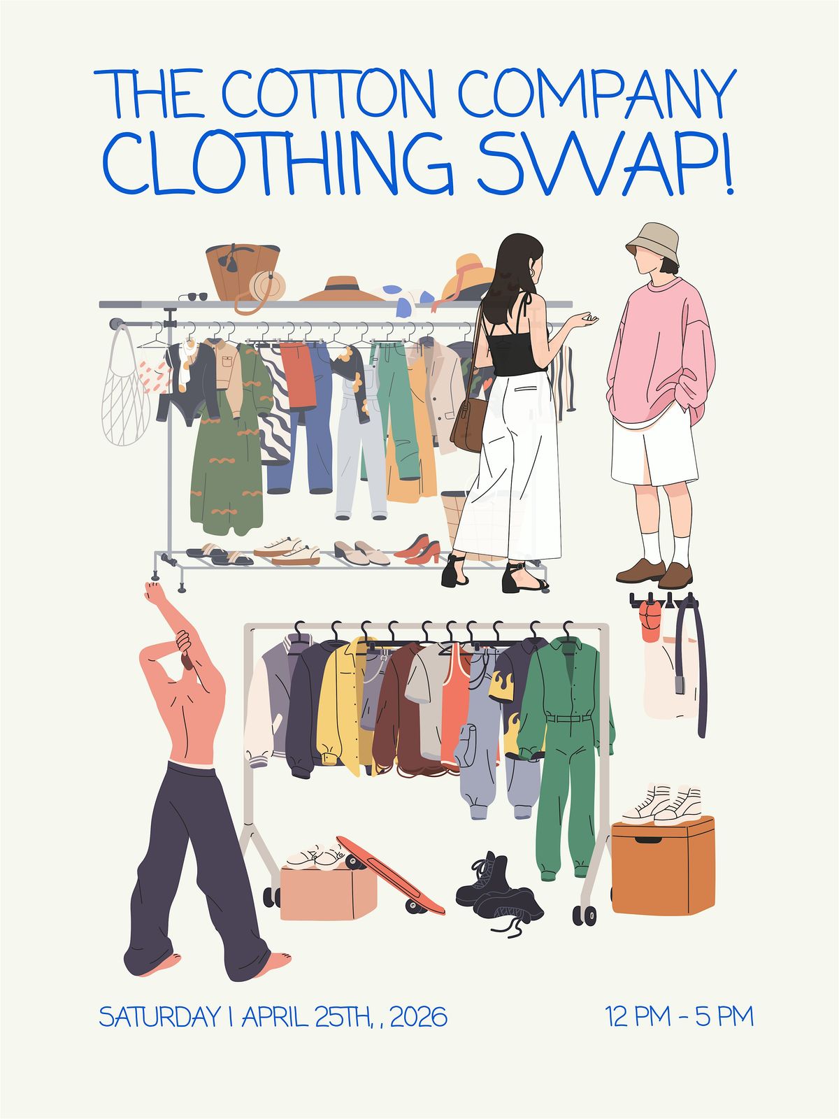 Join us on Saturday, April 25, 2026, from 12 PM–5 PM for an afternoon centered around sustainability, community, and thoughtful style. This is the perfect chance to clear out pieces you no longer wear, discover something new-to-you, and give great clothing a second life.