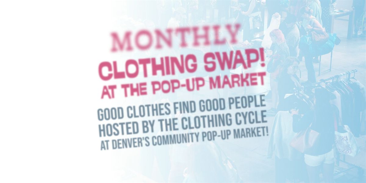 The clothing swap is hosted by @theclothingcycleshop and takes place inside Denver's Community Pop-Up Market, a full day of local shopping, community, and creativity, filling a multi-use warehouse with local makers, artists, and community all in one place.