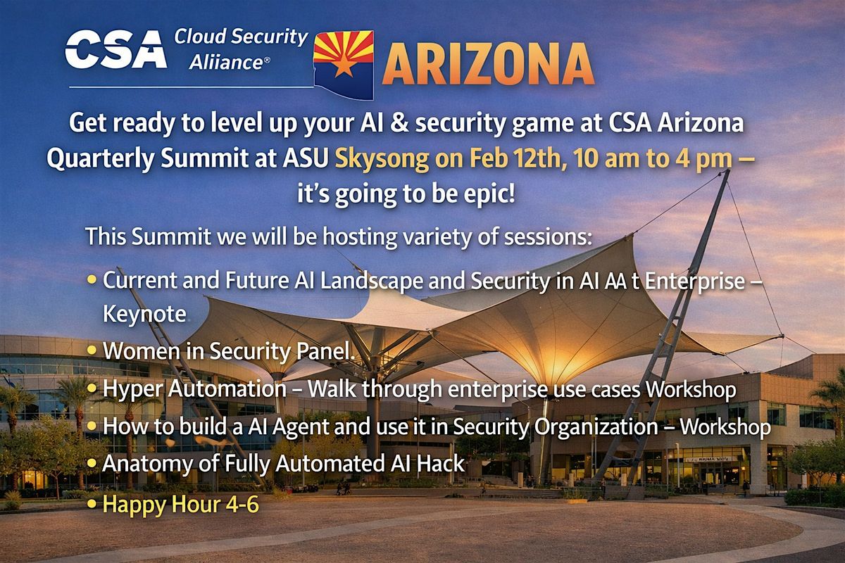 Get ready to level up your AI & security game at CSA Arizona Quarterly Summit at ASU Skysong on Feb 12th, 10 am to 4 pm - it's going to be epic!