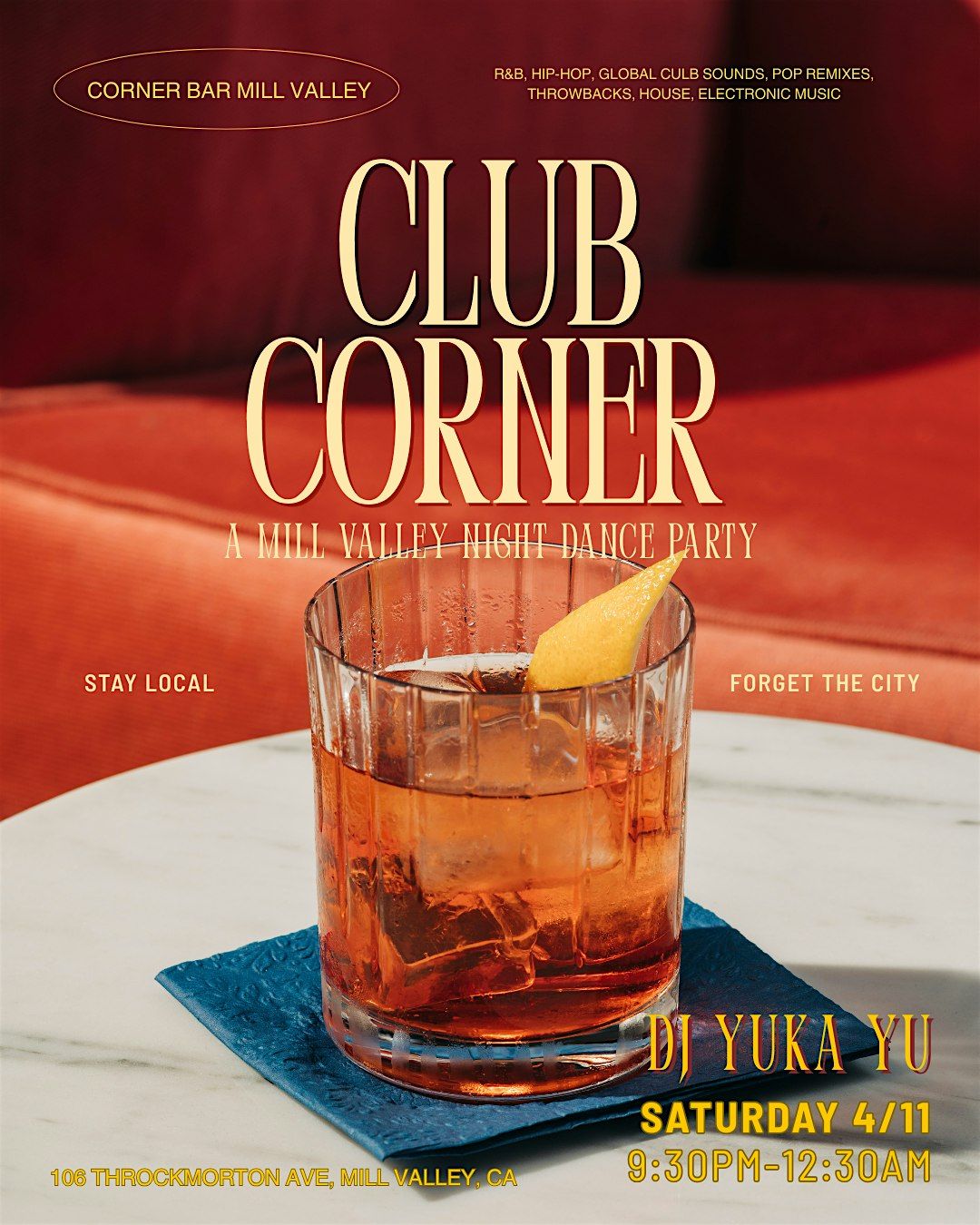 Join us for an intimate night of dancing with DJ Yuka Yu spinning old-skool and new-skool R&B, hip-hop, Global club sounds, pop remixes, throwbacks, house, and electronic grooves at Corner Bar, Mill Valley’s hottest new spot.