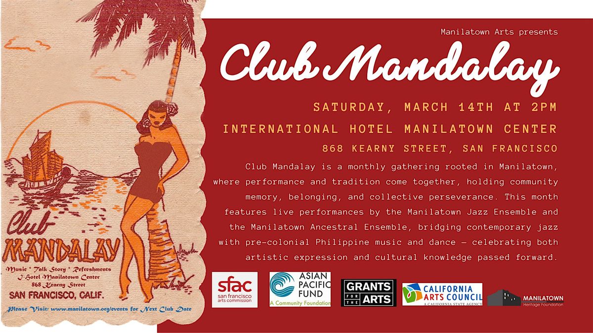 Club Mandalay is made possible by the generous support of the Asian Pacific Fund, San Francisco Grants for the Arts, San Francisco Arts Commission and the California Arts Council. For more information about Club Mandalay, the Manilatown Jazz Ensemble, the Manilatown Ancestral Ensemble, or the Manilatown Heritage Foundation, please contact us at: [email protected]