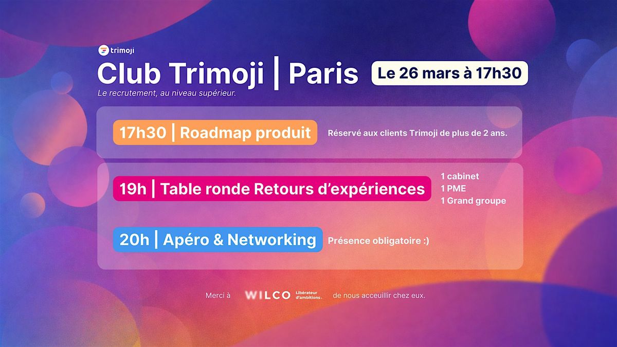 Le Club Trimoji réunit une sélection de clients, partenaires et décideurs RH pour une soirée orientée produit, retours d’expérience et networking.