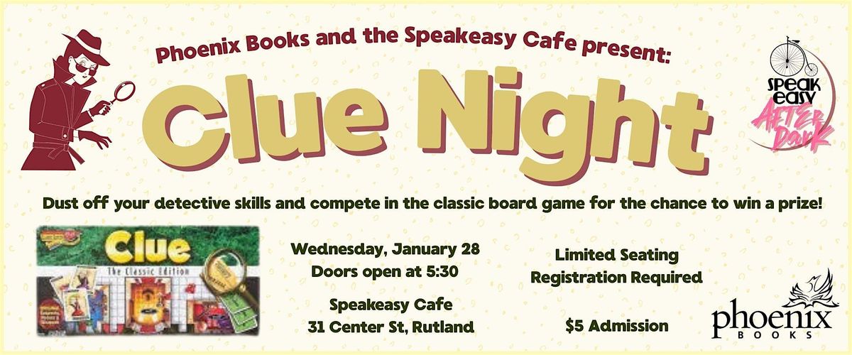 Dust off your detective skills! Phoenix Books and the Speakeasy Cafe are hosting a game night featuring the beloved classic, Clue. Order a drink, visit the Phoenix Books pop-up, and compete with friends for eternal bragging rights - plus the chance to win a prize!