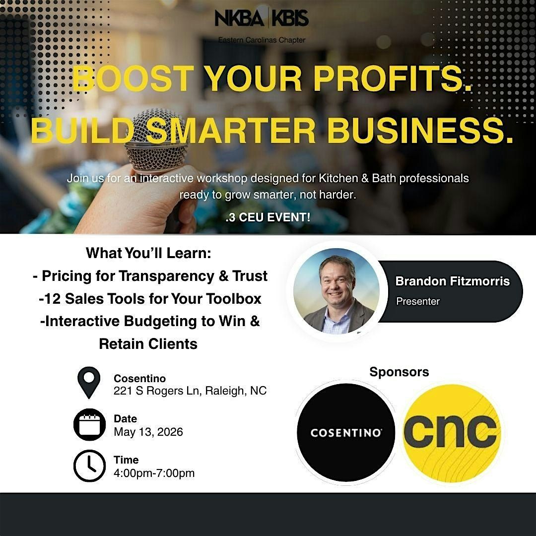 This workshop equips Kitchen & Bath professionals with practical tools to boost profitability using financial benchmarks. Attendees will learn to align gross profit goals with their budget, track key performance indicators (KPIs), evaluate showroom display ROI, and develop an action plan for growth-all reinforced through real-world examples and hands-on exercises.
