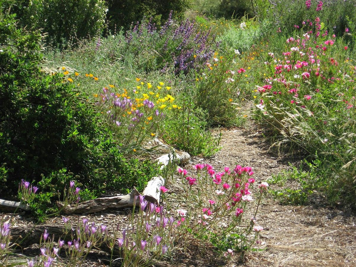 Design and Installation: I designed the garden, and had some help from interns planting it. The plantings are roughly grouped into natural communities that include a redwood grove (inherited), coastal, valley grassland, foothill, slough edge and desert areas. For the past 12 years, friend and naturalist Pat Dressendorfer and I have been collaborating, adding more plants and learning how to more easily maintain what we have. She also kept the garden alive and happy during my 5-year absence.