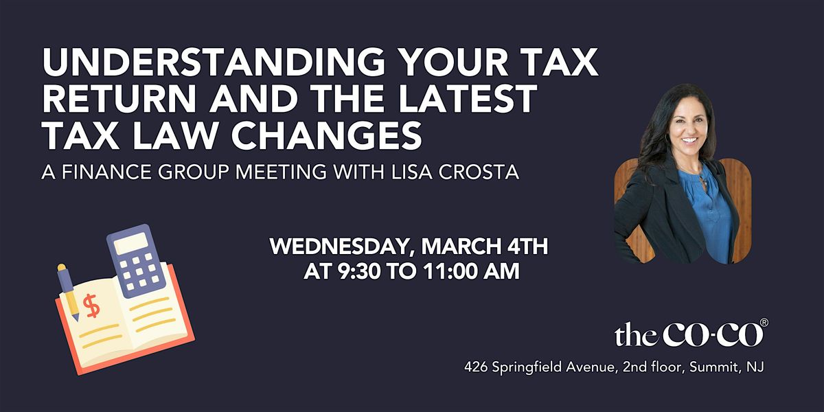 Join us for our January Finance Group meeting: "Understanding Your Tax Return and the Latest Tax Law Changes", presented by Lisa Crosta.