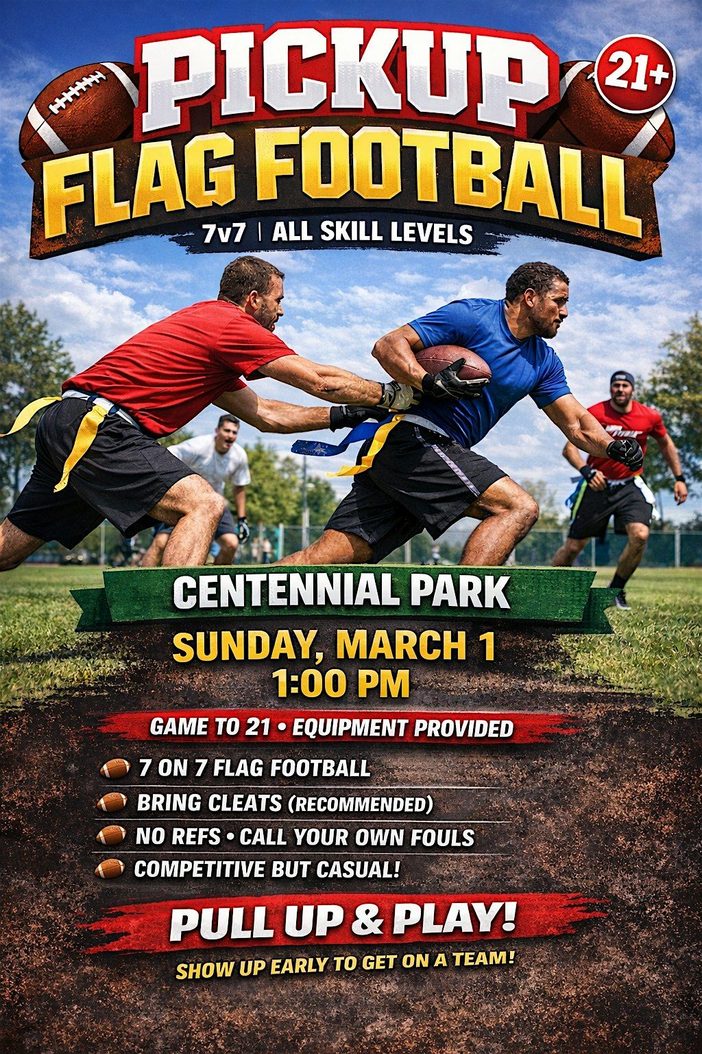Pickup-style coed 7v7 flag football for adults 21+ at Centennial Park. Competitive but casual games to 21 points with all equipment provided. Show up, get on a team, and play.