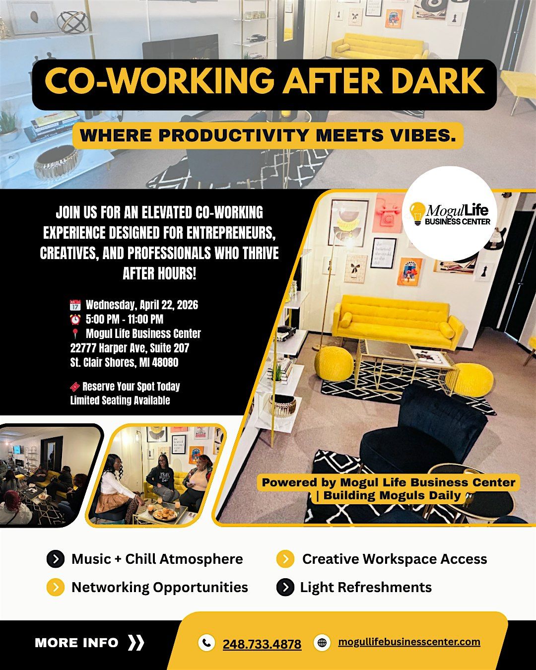 Join us for an elevated co-working experience designed for entrepreneurs, creatives, and professionals who thrive after hours. Whether you're working on your business, content, or next big idea—this is your space to focus, connect, and grow.
