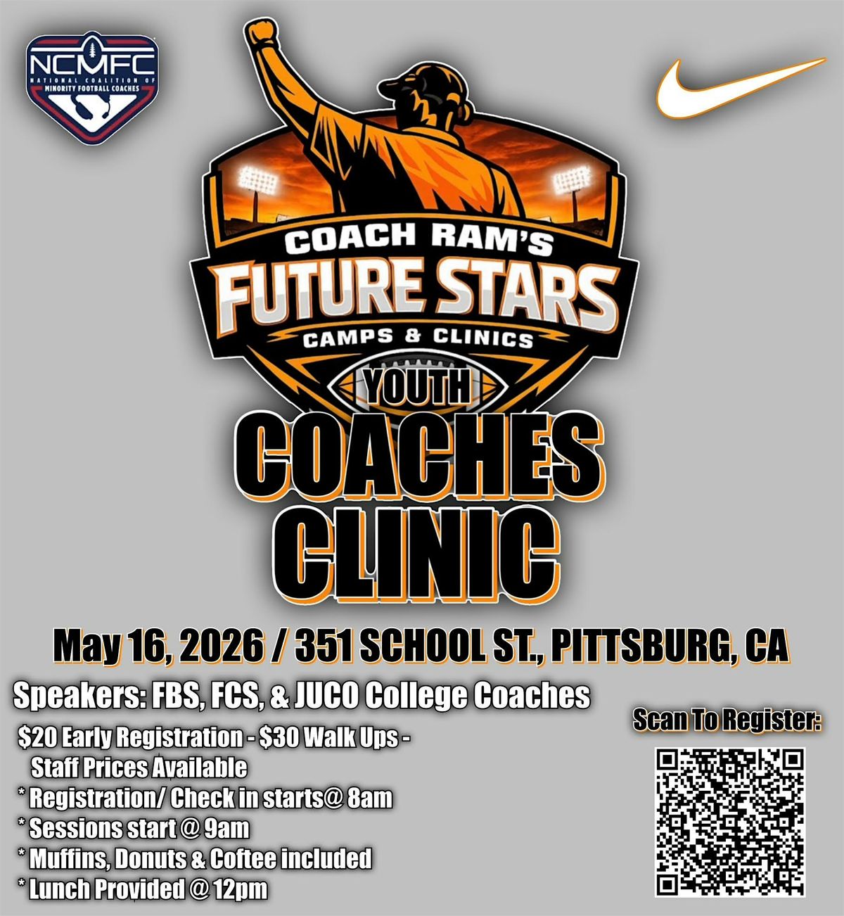 Come join us for the Head Coach Charlie Ramirez's Coaches Clinic! This in-person event will be held at the Pittsburg Football Complex at 351 School Street, Pittsburg, CA. Whether you're a seasoned coach or just starting out, this clinic is the perfect opportunity to learn from experienced professionals, network with other coaches, and enhance your coaching skills. Featuring College coaches from the FBS, FCS and JUCO levels