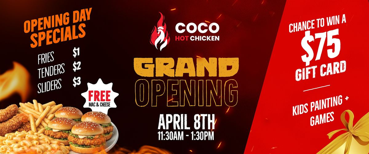 Hey everyone! Get ready to spice things up at the Coco Hot Chicken - Grand Opening. It's happening in person, so come hungry and bring your friends! Dive into the bold flavors and enjoy a fun atmosphere.