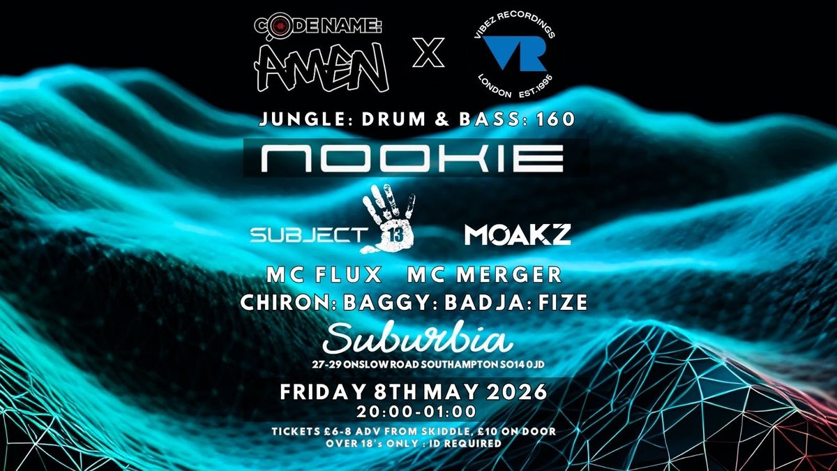 Codename: Amen team up with legendary London imprint Vibez Recordings bringing a heavyweight line-up to Suburbia for a night of underground Jungle & Drum & Bass!Scene legend and true rave pioneer Nookie (Metalheadz, Reinforced, Good Looking, Moving Shadow) heads up the bill alongside Vibez Recordings boss Subject 13 and local hero Moakz (Codename: RCRDS, Vibez Recordings, Soul Deep)